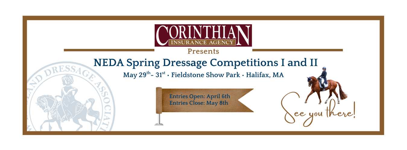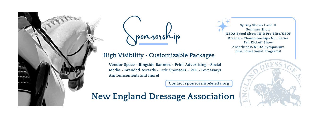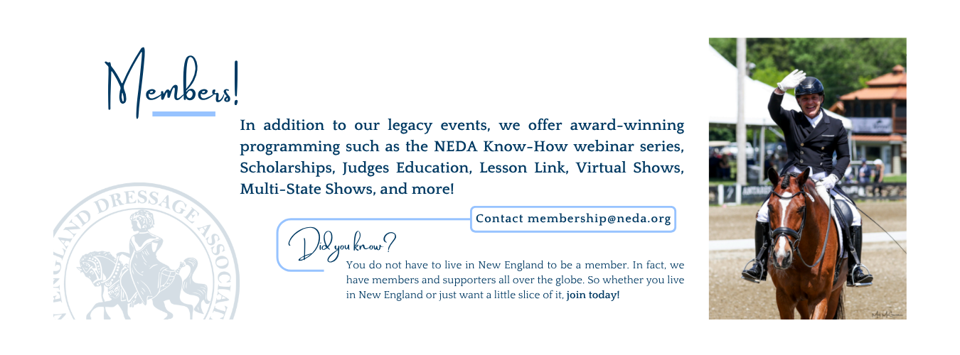 Have we made a difference in the growth and understanding of dressage in the region and in the country? You bet we have. You can see it in this history, and you can see it in the roster of national and international competitors and trainers that our region has spawned. They include Sue Blinks, Dorothy Morkis, Carol Lavell, Lendon Gray, Michael Poulin, Pierre St. Jacques, Pamela Goodrich, Susan Jaccoma, Larry Poulin, George Williams, Karl Mikolka, Shannon Dueck, Arlene "Tuny” Full Page, Ellen Dixon Miller, Bruce Miller, Michael Barisone, Tom Noone, Kathy Connelly, Sally Swift, Cindy Sydnor, Jane Savoie, Karen Stives, Meg Plum, Denny Emerson, Mary Howard, Karen Lende O’Connor and many, many others. And NEDA will continue to nurture the future stars of dressage with its active combination of education, competition, and support for the art and sport of dressage.