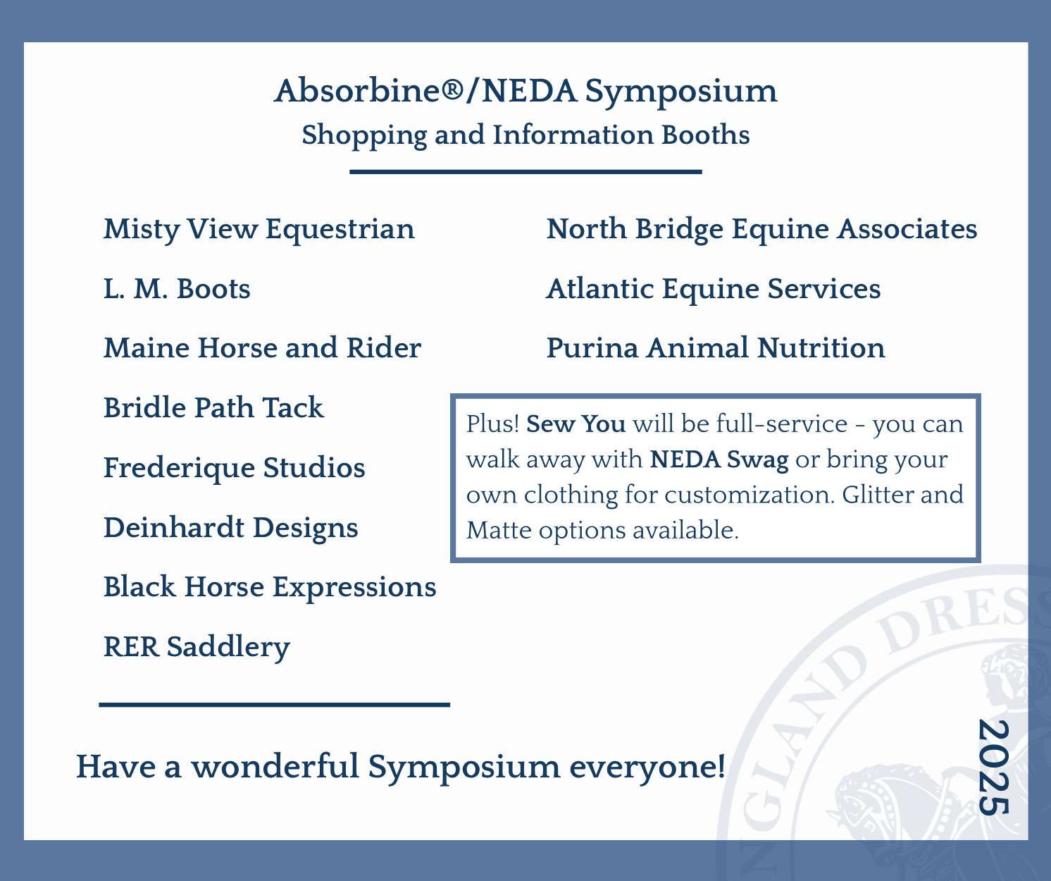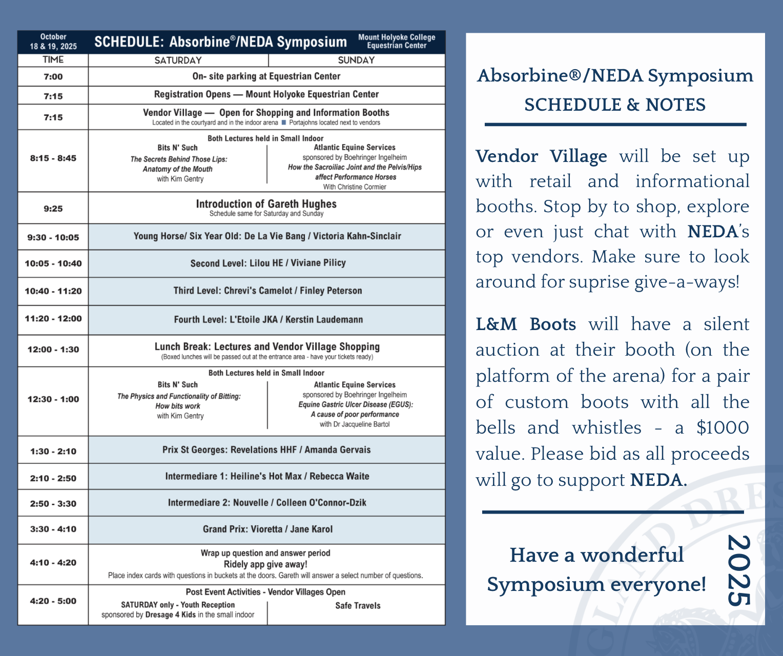 We are all looking forward to welcoming you to the Absorbine/ NEDA Symposium with Gareth Hughes. To make your symposium experience enjoyable we are sending you these notes. Your support of the symposium is appreciated.